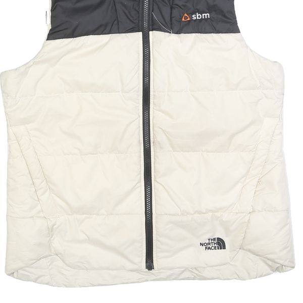 This women's jacket by The North Face features a contrasting black and cream colour block design, with a high collar for added warmth. The front showcases a zip closure and the iconic The North Face logo embroidered on the lower hem and upper back. The chest area also has a small 'sbm' logo.