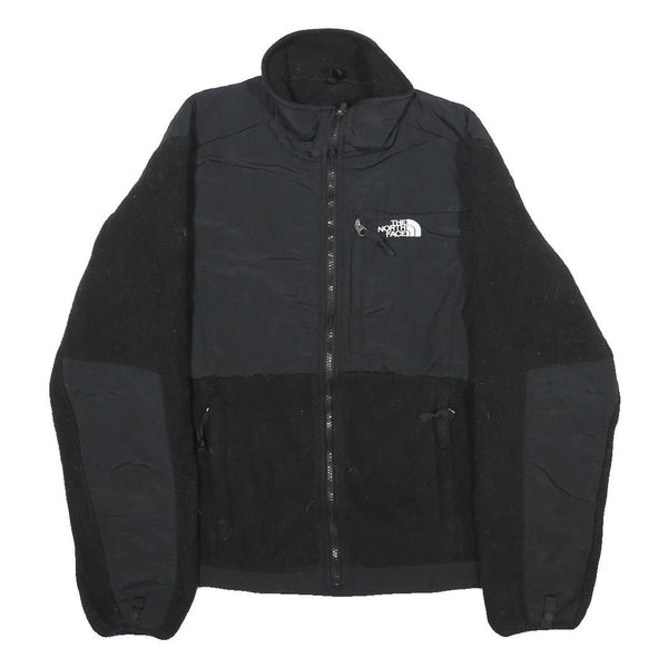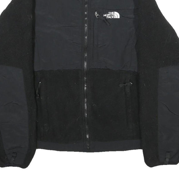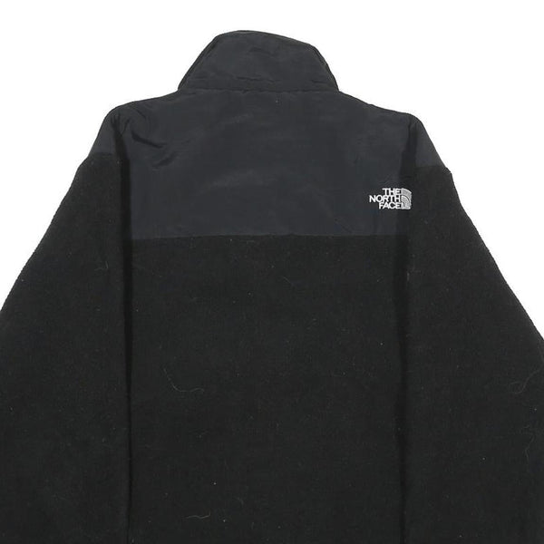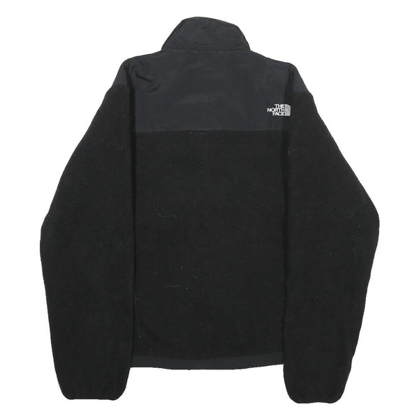 This womens THE NORTH FACE jacket features a classic black colour with a combination of soft fleece and durable polyester blend fabric panels. The front displays the brand's signature logo on the left chest pocket, and the back bears the logo on the upper right shoulder.