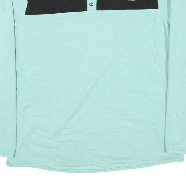 This womens jumper from THE NORTH FACE features a two-tone design with a black upper chest and collar contrasted against a light green main body and sleeves. The front showcases a half snap button placket and the iconic white embroidered THE NORTH FACE logo on the left chest.