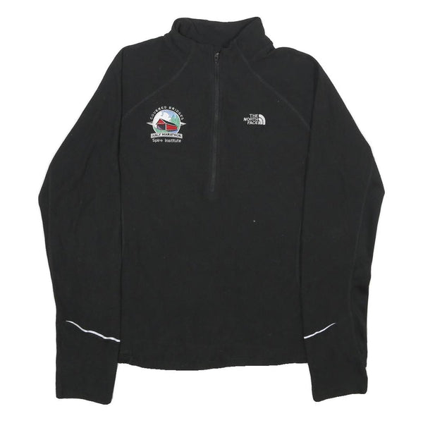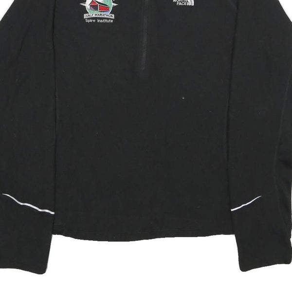 This womens jumper from The North Face is primarily black with embroidered detailing on the front left chest. It features the logo for a "Covered Bridges Half Marathon Spire Institute," alongside the brand's own white embroidered logo on the right chest. The jumper is made from polyester, delivering a lightweight and comfortable feel.