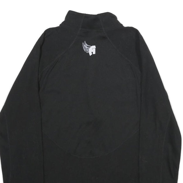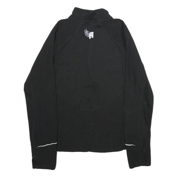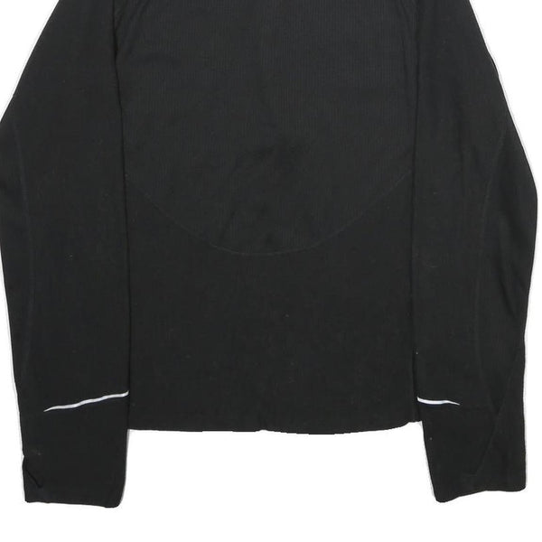 The fit appears regular with a long-sleeve design and a pullover style featuring a quarter zip at the collar for adjustable ventilation. The neckline is a crew neck style, and it has reflective details on the sleeves for added visibility. The back shows a small graphic near the neckline, adding to the sporty aesthetic.