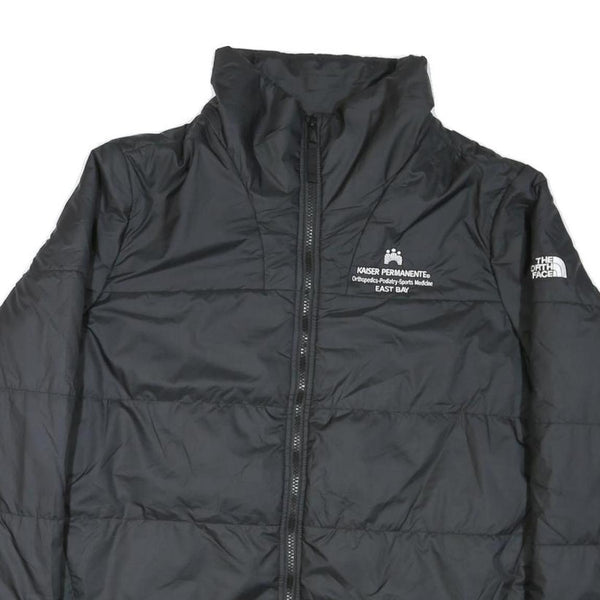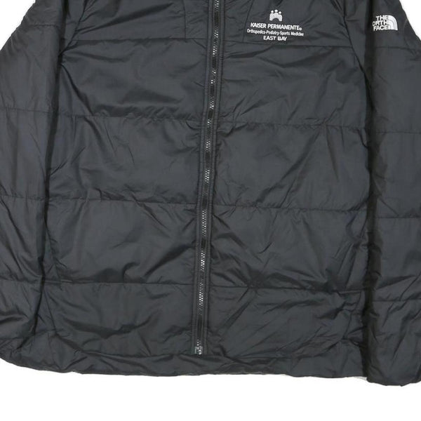 This womens jacket by THE NORTH FACE features a plain black exterior with a full front zip closure. It bears distinctive branding logos on the left chest with "KAISER PERMANENTE Orthopedic-Podiatry-Sports Medicine EAST BAY" printed in white and the classic THE NORTH FACE logo embroidered on the left sleeve and back shoulder.