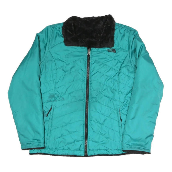 This womens jacket by The North Face showcases a vibrant blue exterior with a contrasting black reversible interior, allowing two distinct looks. It features a stand-up collar, long sleeves, and embroidered logos on the chest and upper back for a subtle branded touch.