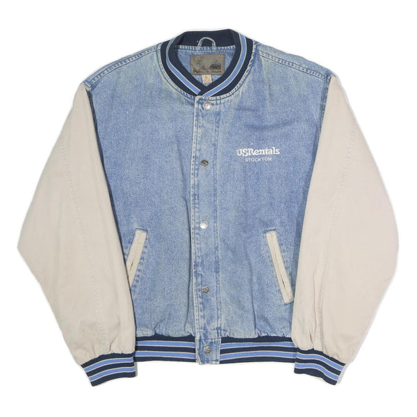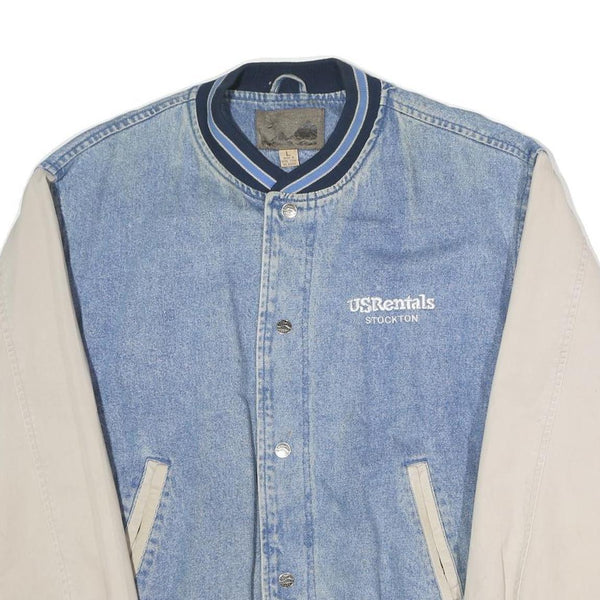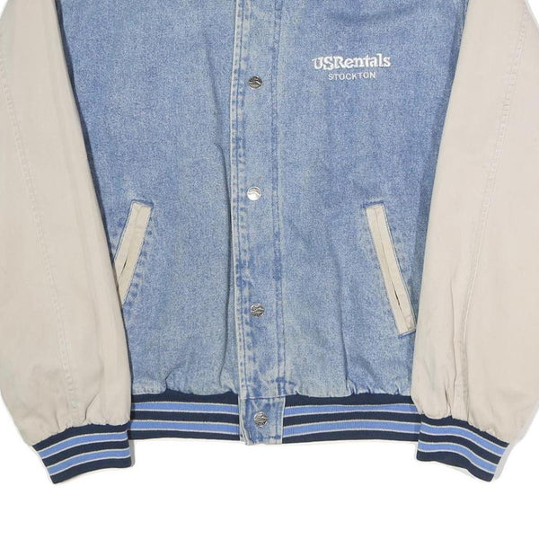 Constructed from durable cotton denim and plain cream cotton fabric, it offers a comfortable fit with button closure and side pockets. The front bears embroidered text "US Rentals Stockton" enhancing its casual and vintage sportswear appeal.