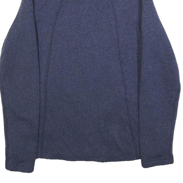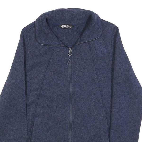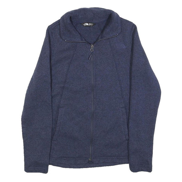 This womens jacket from The North Face features a deep blue colour with a subtle texture and a plain pattern. It has a full front zip closure and a stand-up collar for added neck protection. The material is a soft polyester blend, providing warmth and comfort ideal for cooler weather.