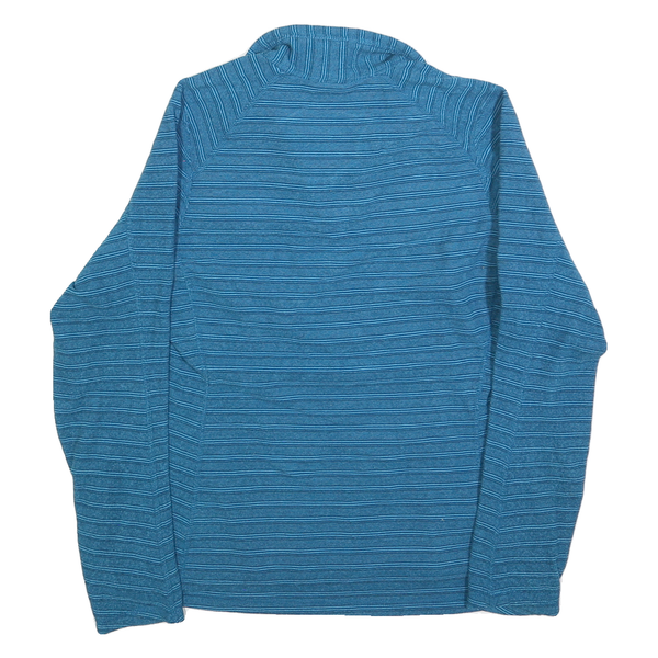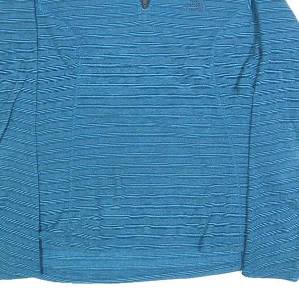 This womens jumper from THE NORTH FACE features a blue tonal striped pattern throughout with a subtle embroidered brand logo on the left chest. It has a 1/4 zip neckline that allows adjustable ventilation and easy wear. The fabric has a smooth, lightweight polyester feel ideal for layering or standalone use.