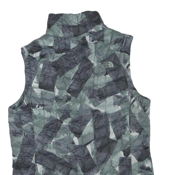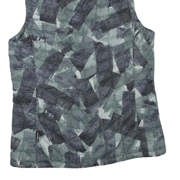 This womens gilet by The North Face features a quilted pattern in shades of grey and black with an abstract camo-like design. The lightweight polyester blend fabric offers warmth and a smooth feel ideal for layering. It has a high stand-up collar and a central zip closure, making it practical and easy to wear.