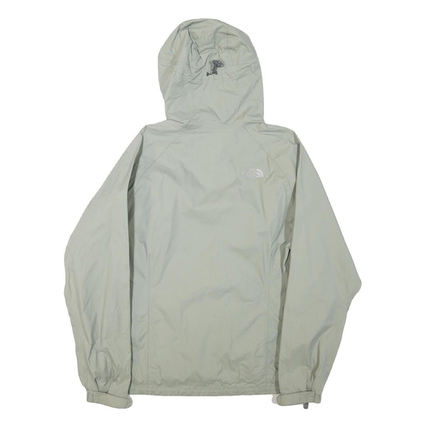 This womens jacket by The North Face is presented in a soft grey tone with subtle branding embroidered on the chest. It features a hood with adjustable drawstrings, a full-length zip closure with a storm flap, and long sleeves with adjustable cuffs. The jacket has a minimalist, plain design offering versatile outdoor style.