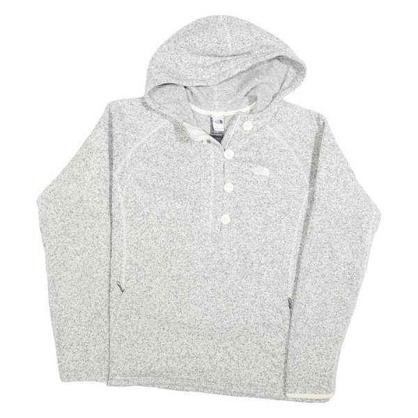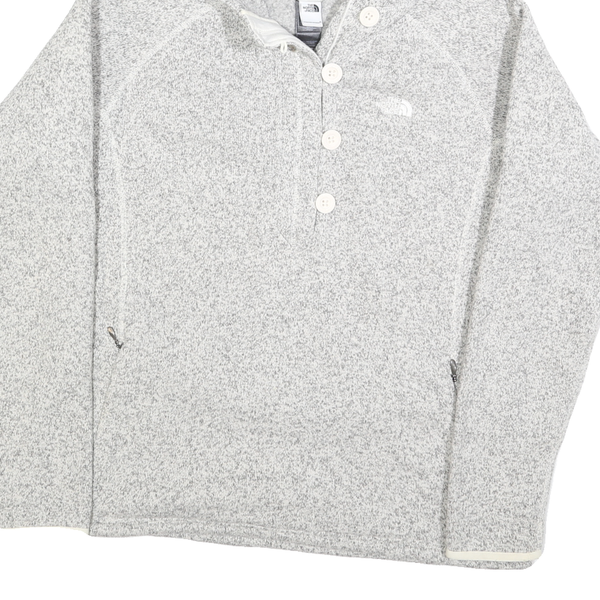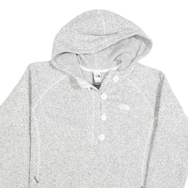 This womens jumper from The North Face features a soft grey patterned knit with subtle white speckling throughout. It has a pullover design with a neat crew neck style and a comfortable hood for added warmth. The front has a button fastening with four cream buttons that add a stylish detail along with the small embroidered white logo on the chest.