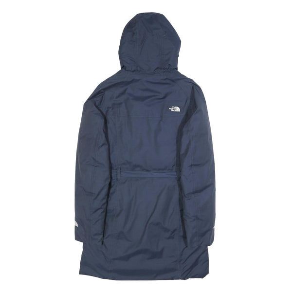 This womens jacket by The North Face features a deep navy blue colour throughout with a subtle belt at the waist for added shape. It has a practical hood with drawstring adjusters and a full front zip closure hidden beneath a storm flap. The coat showcases The North Face logo in white on the front hem and upper back, offering subtle branding.