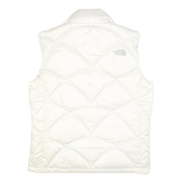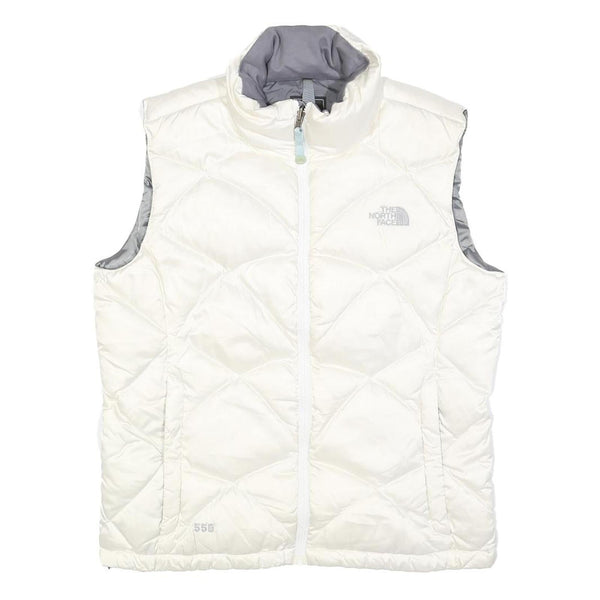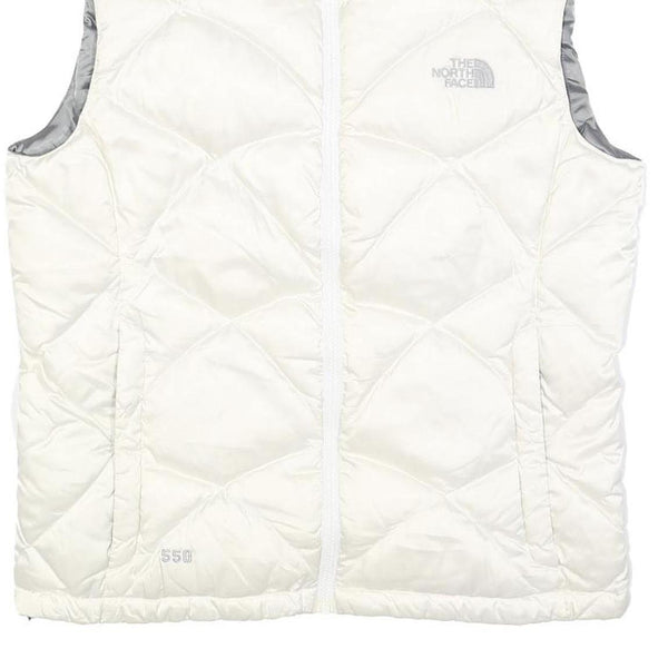 This womens jacket by The North Face features a clean white colour with a subtle quilted pattern in a lightweight design. The front sports a full zip closure with the brand’s iconic embroidered logo on the chest area along with a smaller embroidered logo and the number '550' near the hem. The inside collar has a contrasting soft grey lining, enhancing both comfort and style.