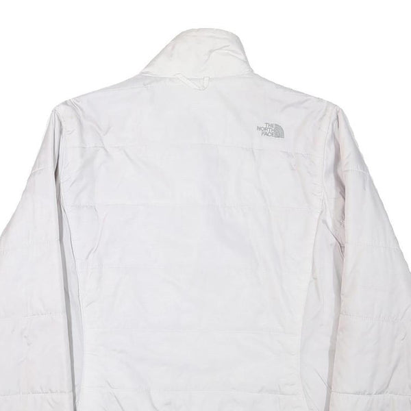 This womens THE NORTH FACE jacket comes in a clean white colour, featuring a subtle brand logo embroidered on the chest and upper back. The design is plain with a sleek, minimalistic appearance. It has a full zip closure running down the front.