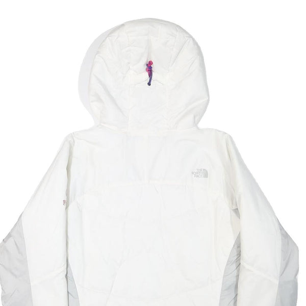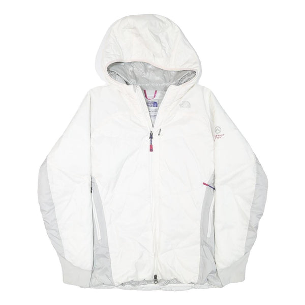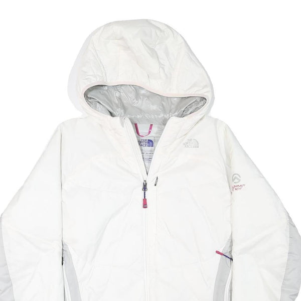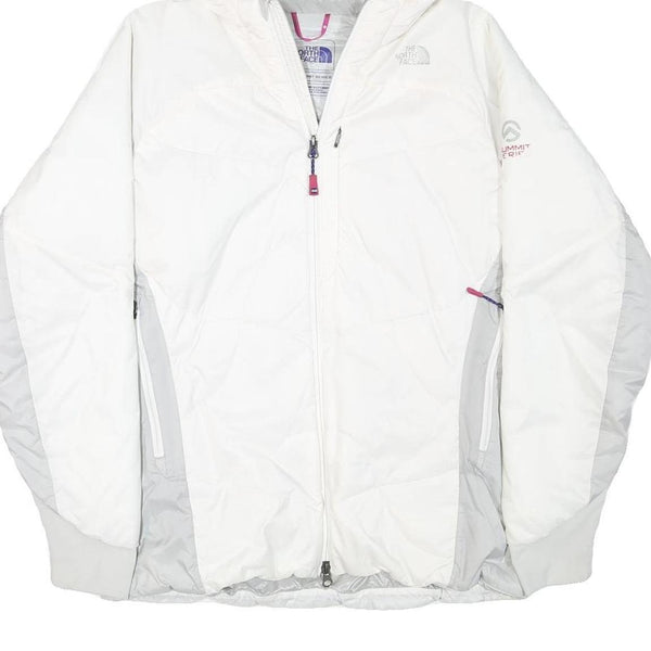 This womens North Face jacket presents a clean white profile complemented by light grey panels on the sides and under the sleeves. It features subtle branding with the North Face logo on the front chest and back shoulder area, and Summit Series text on the sleeve. The jacket has a full-length zip closure and an attached hood offering added protection against the elements.