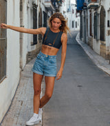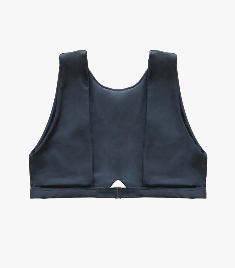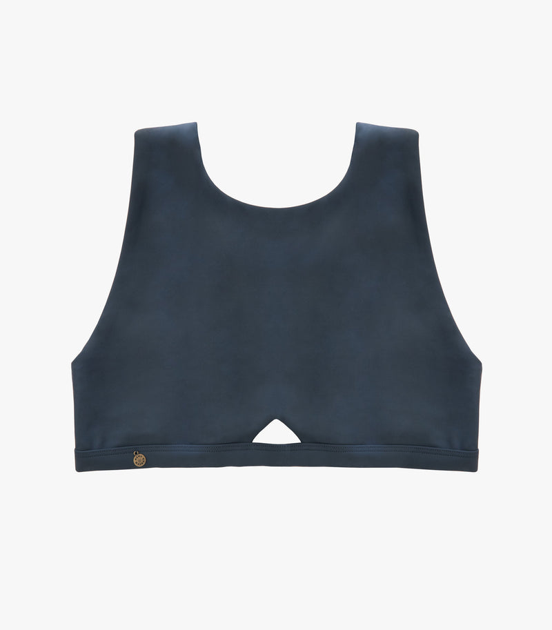 The Tank top is a cropped top featuring a front center cut-out detail, with a feminine open back and an adjustable bust band for extra comfort and support.