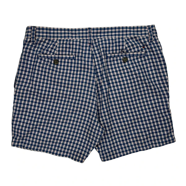Blue And White Checked Chino Shorts With Buttoned Back Pockets.
