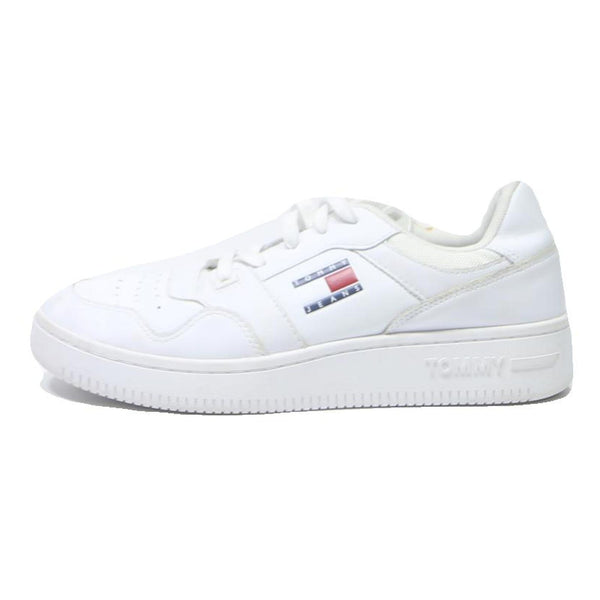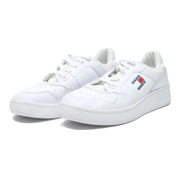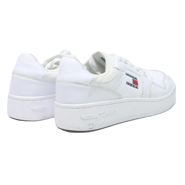 These womens trainers feature a clean white leather upper with subtle tonal stitching and perforated details on the toe for breathability. The classic Tommy Hilfiger flag logo is prominently displayed on the side panel, adding instantly recognisable branding to the design.