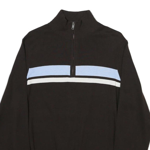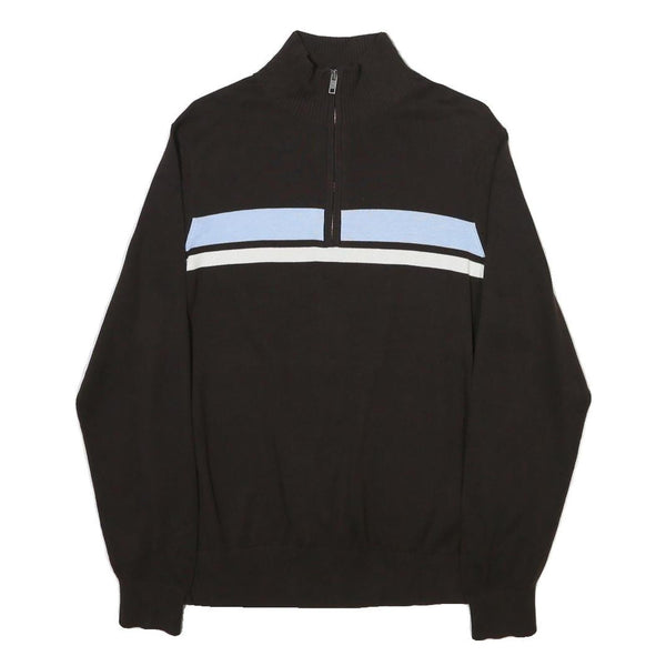 This Tommy Hilfiger mens jumper features a classic black base with a horizontal stripe pattern across the chest in light blue and white, offering a sporty and stylish contrast. The half zip closure extends to a ribbed crew neck collar, adding versatility to the fit and easy wear. A small Tommy Hilfiger flag logo is subtly positioned near the cuff.