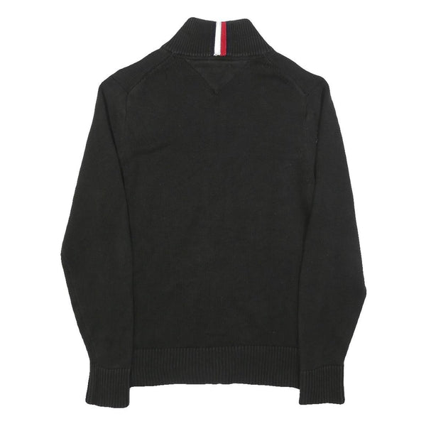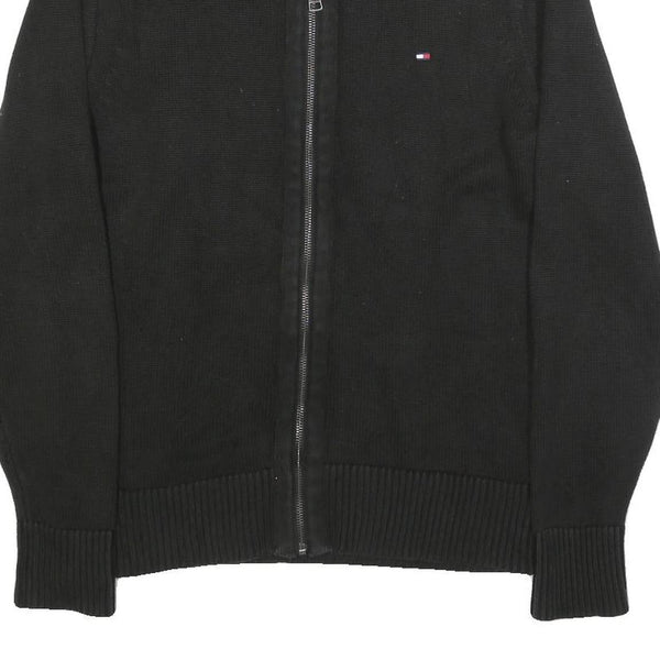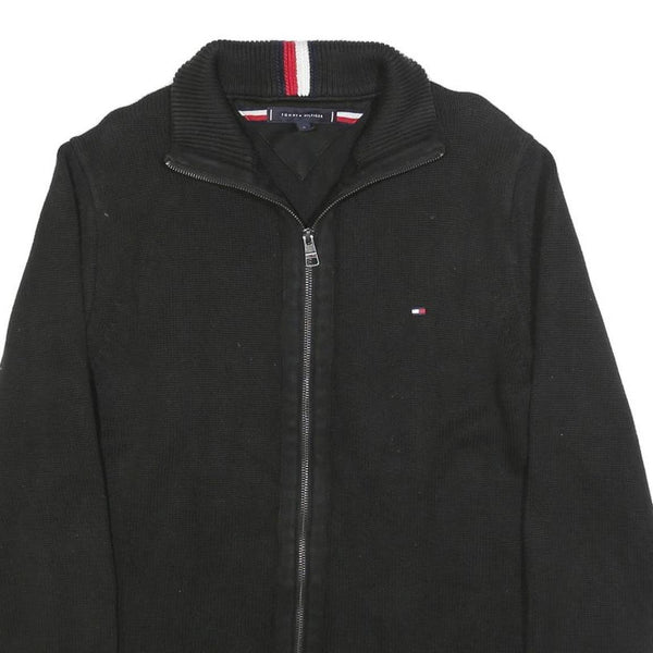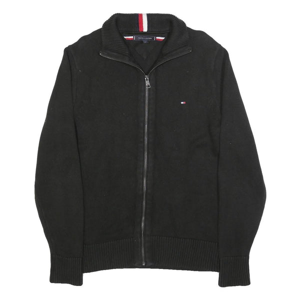 This Tommy Hilfiger mens jumper features a classic black colour throughout with a subtle embroidered Tommy Hilfiger flag logo on the chest. The jumper has a full zip front and ribbed collar, cuffs, and hem for a snug fit. A signature red, white, and blue stripe detail runs inside the collar.