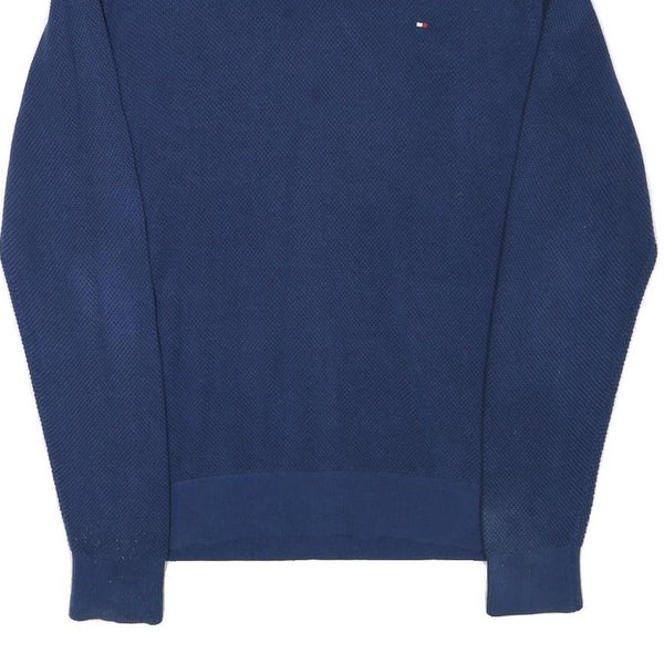 This Tommy Hilfiger jumper features a rich blue colour with a subtle textured pattern throughout. It has a classic crew neck design with ribbed trims on the collar, cuffs, and hem. The small, embroidered Tommy Hilfiger flag logo is discreetly placed on the chest for a touch of branded style.