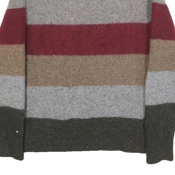 This Tommy Hilfiger mens jumper features broad horizontal stripes in navy blue, grey, maroon, tan brown, and dark green. The colours are rich and create a classic multi-stripe design with a woven texture typical of wool blends. Subtle Tommy Hilfiger branding is embroidered near the hem.