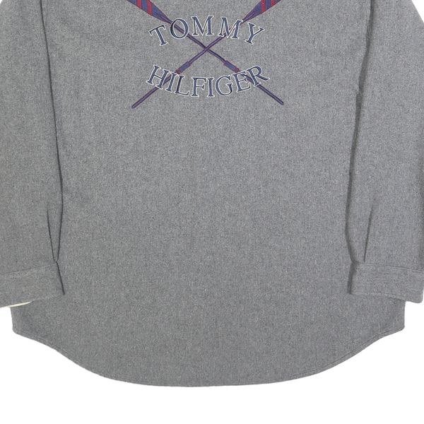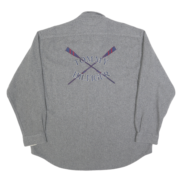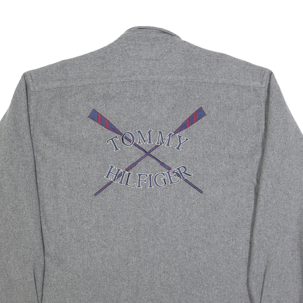 This Tommy Hilfiger mens shirt features a distinct blue and grey striped design on the front, offset by solid grey sleeves and back. It has a button-down collar, button closure, and a chest pocket embroidered with the iconic Tommy Hilfiger crest. The back showcases embroidered crossed oars with "TOMMY HILFIGER" text arched in blue and red.