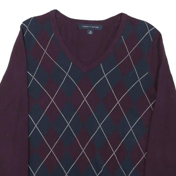TOMMY HILFIGER Mens Burgundy & Navy Argyle Pattern V-Neck Basic Knit S Sweater