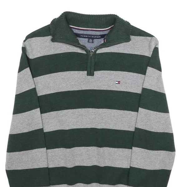 This Tommy Hilfiger jumper features bold horizontal green and grey stripes for a classic patterned look. The half-zip V-neck includes a ribbed collar that adds a bit of structure and style, accompanied by a small Tommy Hilfiger flag logo stitched on the chest.