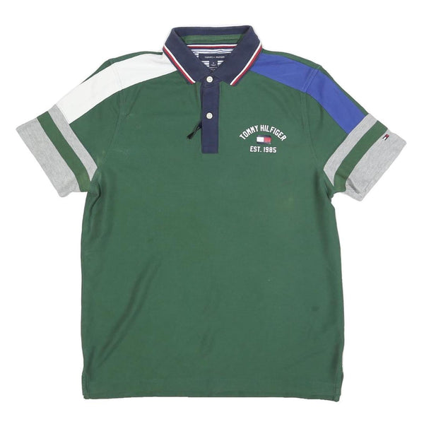 This Tommy Hilfiger mens polo shirt features a primary green colour with contrasting navy blue collar and upper shoulder patches in blue and white, complemented by grey sleeves with green and grey striping. The front showcases the embroidered Tommy Hilfiger logo with "Est. 1985" text and the classic flag emblem, adding a refined branded detail. The collar is a traditional ribbed band style with a button placket closure.