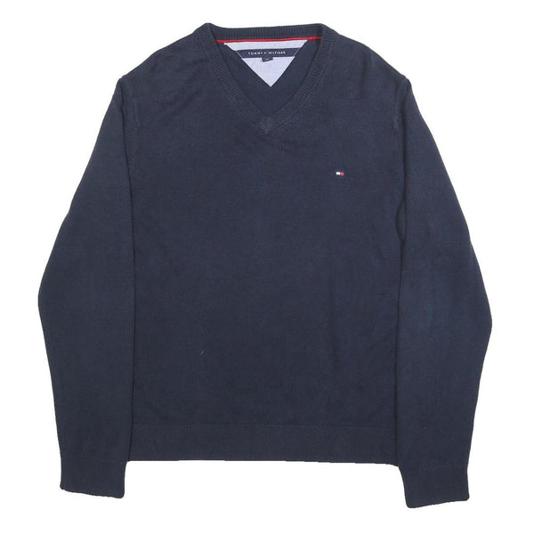 TOMMY HILFIGER Mens Navy Plain Cotton Blend Regular Fit V-Neck Jumper L Classic