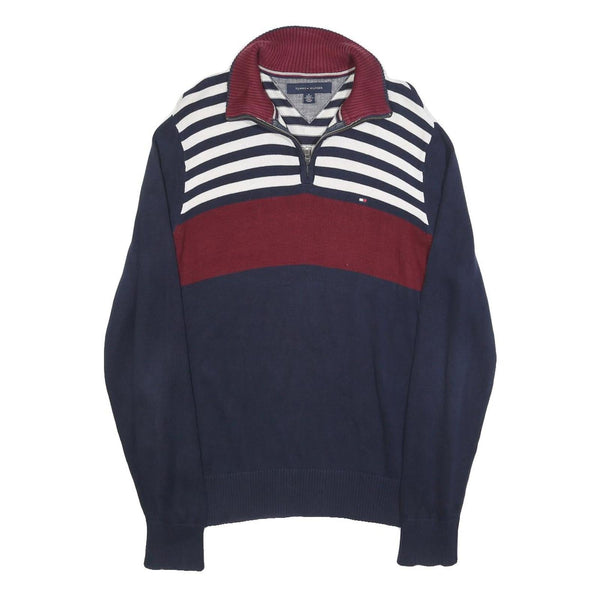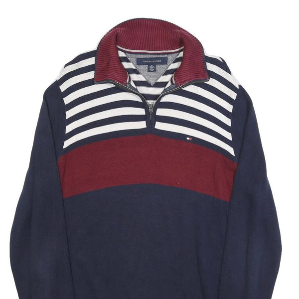This Tommy Hilfiger mens jumper features a stylish colourblock design with a navy base, a bold red horizontal stripe across the chest, and white and navy stripes on the upper front and back. The half-zip neckline comes with a ribbed red collar, complementing the overall look with subtle branding embroidery on the chest.