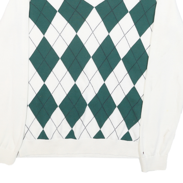 This Tommy Hilfiger mens jumper features a striking white and green argyle pattern across the front with a clean white background on the sleeves and back. The classic V-neckline enhances its timeless, preppy look. Branding is subtly present with the Tommy Hilfiger label visible inside the neckline.