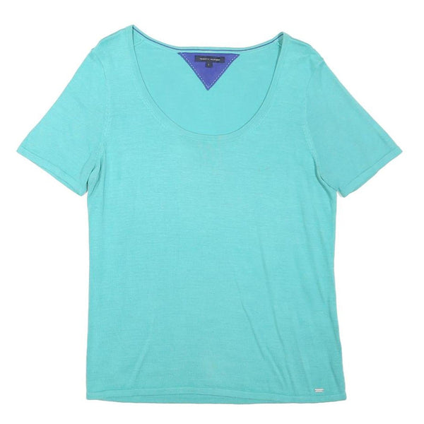 TOMMY HILFIGER Womens Aqua Plain Cotton Blend Jumper L Short Sleeve Round Neck