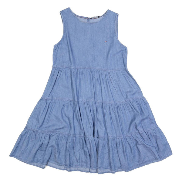 This Tommy Hilfiger womens dress features a soft blue denim-look cotton blend fabric with a sleeveless design. It has a simple round neckline and a small embroidered Tommy Hilfiger logo on the front chest. The dress flows into a tiered, fit and flare skirt with a midi length, providing a comfortable and flattering silhouette.