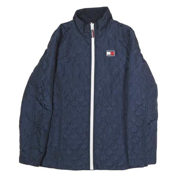This Tommy Hilfiger womens jacket features a deep blue colour with a subtle quilted pattern throughout. The front is decorated with an embroidered Tommy Hilfiger flag logo on the left chest, and the jacket closes with a contrasting white zip. It has a stand-up collar and long sleeves for added coverage.