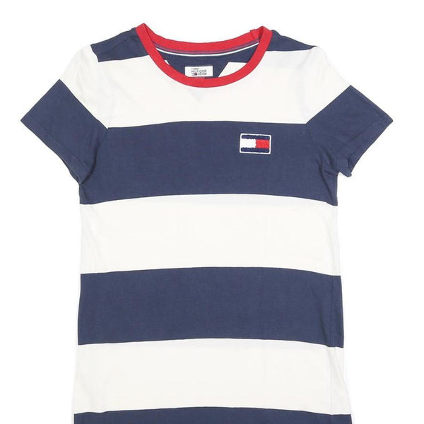 This Tommy Hilfiger dress features bold horizontal blue and white stripes, contrasted with a red crew neckline for a classic sporty style. The iconic Tommy Hilfiger flag logo is embroidered on the chest, showcasing the brand's timeless American aesthetic.