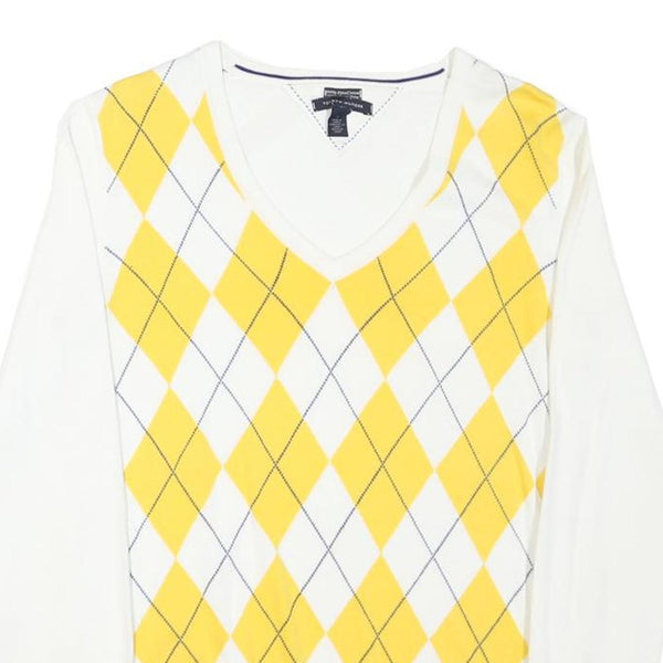 This Tommy Hilfiger ladies jumper features a vibrant white base with a bold yellow and navy blue argyle pattern across the front. The back and sleeves remain solid white, offering a clean contrast. The V-neckline adds a classic touch to this stylish piece, perfect for layering or wearing solo.