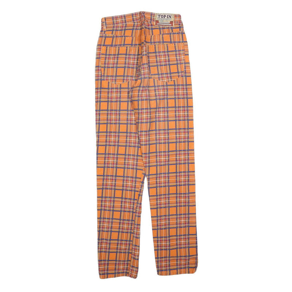 These womens TOP IN trousers feature a striking tartan pattern in vibrant orange and purple shades, creating a bold and fashionable look. The front boasts a classic five-pocket style with a zip closure and button securing the waistband. The rear has patch pockets and a branded label on the waistband, adding a hint of vintage appeal.