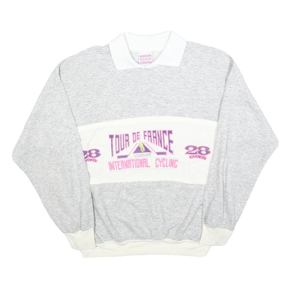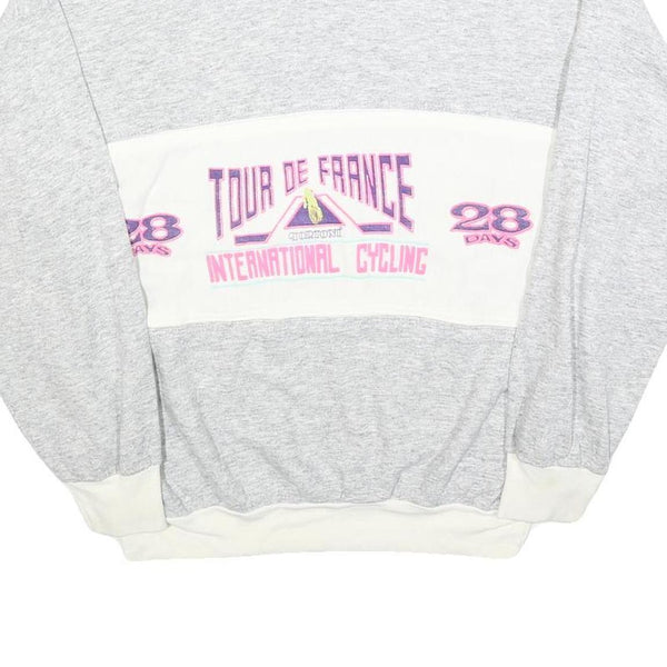This Tortoni womens sweatshirt features a light grey and white colourblock design with a prominent Tour De France International Cycling graphic on the front panel accented in pink and purple. The detailing includes the "28 Days" motif, emphasising the cycling theme. It has a classic white collar adding a sporty touch to the pullover.