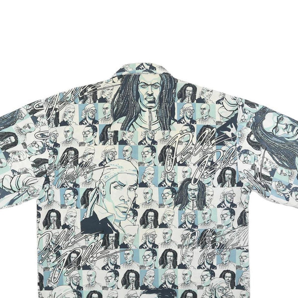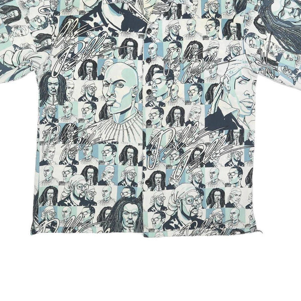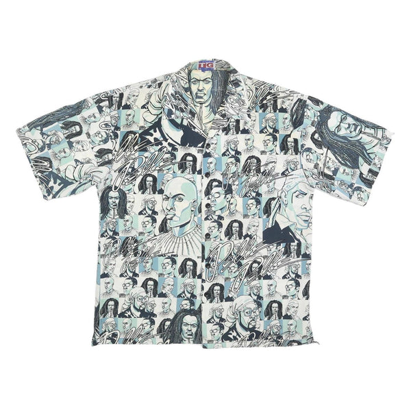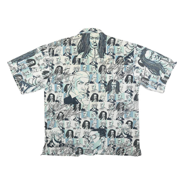 This Tough Guy mens shirt features an all-over distinctive graphic print consisting of stylised illustrated portraits in shades of white, blue, and black. The short-sleeve shirt has a casual relaxed fit with a spread collar and button front closure, offering a bold and artistic statement piece.
