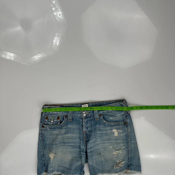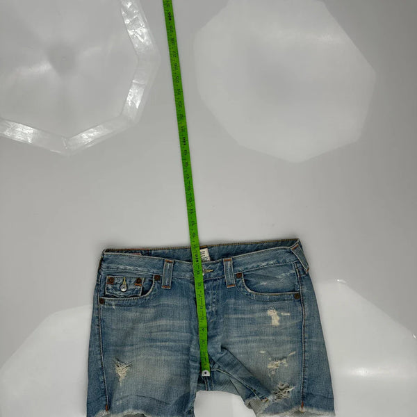 True Religion Denim Shorts, fit a US size 8 with a 34″ Waist.