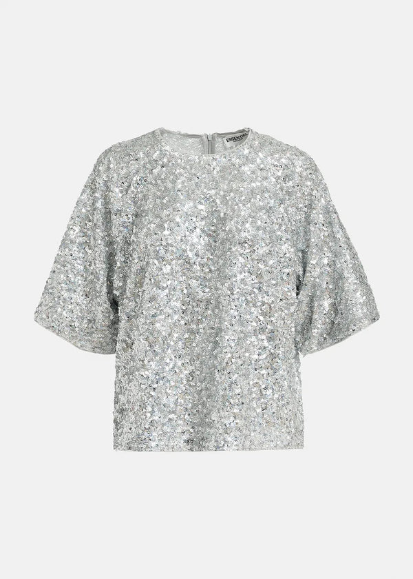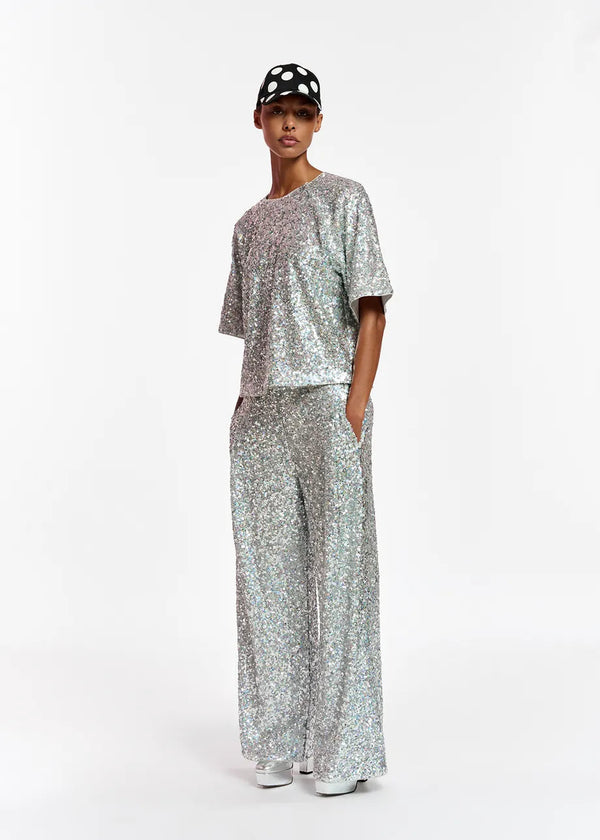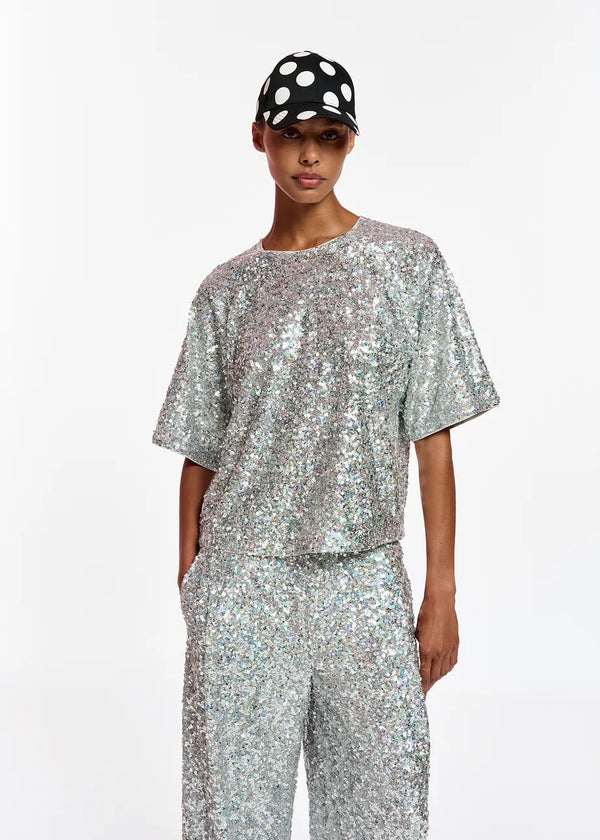 Entirely drenched in shimmering sequins, this short-sleeved top is sure to sparkly from every angle. Otherwise kept minimal, the style has an oversized, boxy fit and a classic round neckline.