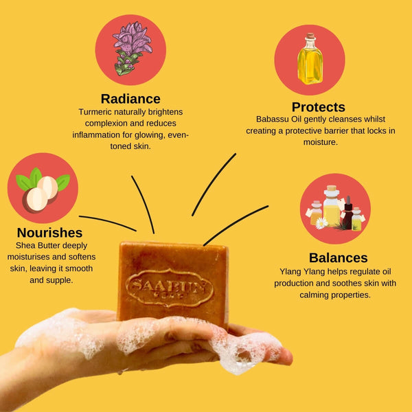 Introducing our Turmeric Soap Bar for Hands, Body and Face, a natural and gentle solution for all your skin care needs. This soap bar is handmade with a blend of essential oils including Magnolia, Ylang Ylang, Frankincense and Turmeric, as well as ground Turmeric, to provide a range of skin-loving benefits. The addition of Shea Butter and Babassu Oil leaves your skin feeling moisturised and nourished.