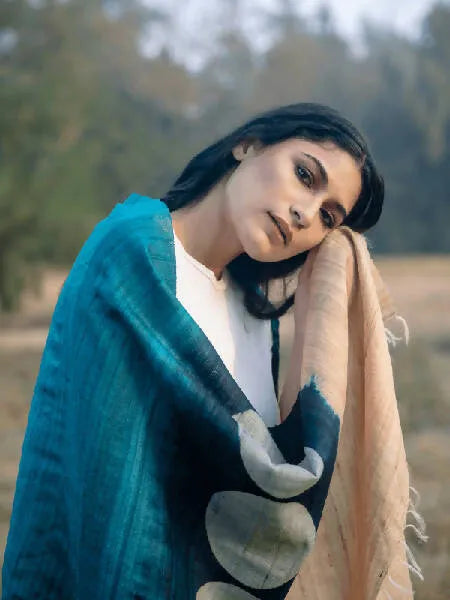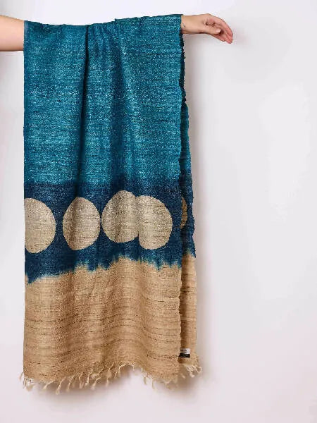 The scarf is a beautiful mix of geometric patterns in ink blue and navy blue on a rich base of golden beige. It is an elegant accessory which can complement a wide range of outfits and colors. Crafted in handwoven pure Tussar silk this scarf is luxurious and elegant. The design is inspired by fallen foliage after the monsoons in India.