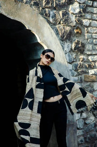 The newest addition to our Clear Geometric line. Tussar silk scarf Cora is a bold awe-inspiring design. The bold black semi-circles and triangles are playfully placed on a rich golden beige base, resulting in a scarf that is extremely stylish and elegant. An accessory perfect for all occasions. Made of Tussar Silk, one of the highest quality silks, this play of black and beige truly sets it apart