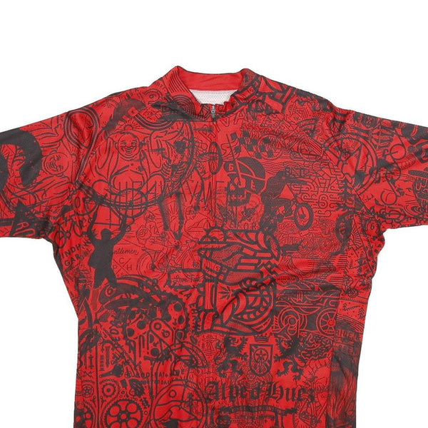 This Mens Twin Six T-Shirt features a bold red base with an intricate black graphic print covering the entire shirt front, back, and sleeves. The design includes cycling-inspired motifs and abstract illustrations, creating a dynamic and eye-catching look. The shirt has a short sleeve style and a classic crew neck, ideal for active and casual wear.