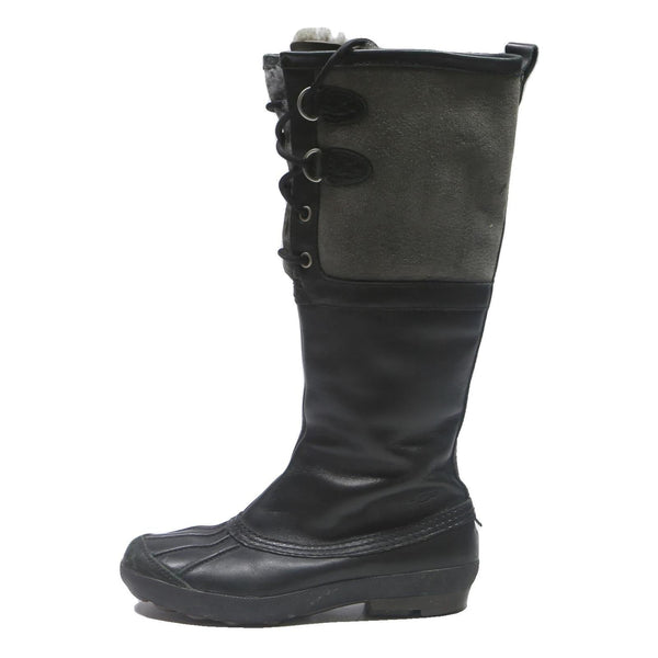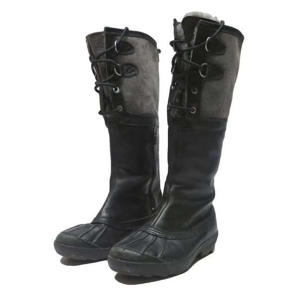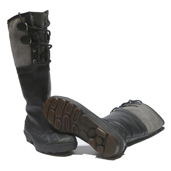 These womens UGG Adirondack boots combine black and grey tones with a synthetic upper for a practical yet stylish look. The boots feature a lace-up front panel with eyelets and a pull tab at the back for ease of wear. The outsole is rugged and durable, suitable for winter conditions.