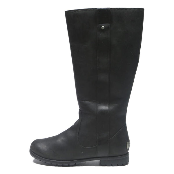 These UGG Classic boots for womens feature a sleek black synthetic finish extending to knee height, offering an effortlessly stylish look. The exterior is smooth with a subtle UGG logo detail on a small metal plaque near the heel and a discreet rivet on the shaft to enhance the design.