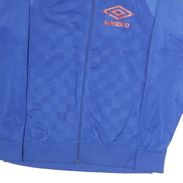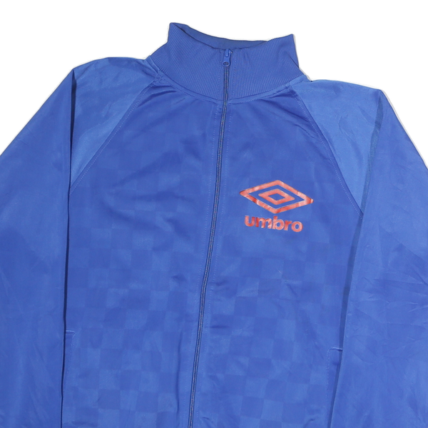 This Mens Umbro track jacket features a vibrant blue colour with a subtle checkerboard pattern across the fabric. The signature Umbro double diamond logo is prominently displayed on the chest in a contrasting orange-red tone. It has a stand-up collar and long raglan sleeves with ribbed cuffs and hem for a secure fit.