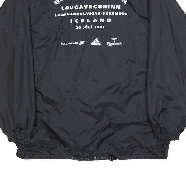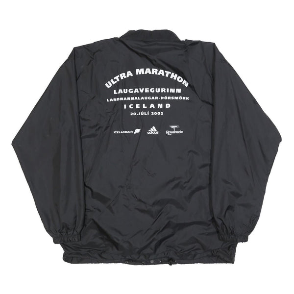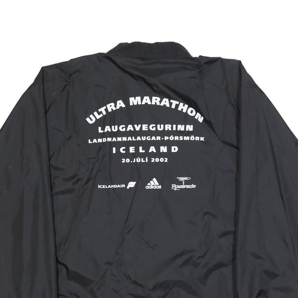 This US BASIC Mens jacket features a solid black nylon exterior with a classic coach jacket silhouette. The front showcases a button closure with two slanted pockets, elasticated cuffs, and a drawstring hem for a versatile fit. On the back, bold white text proudly declares the "Ultra Marathon Laugavegurinn" event held in Iceland on 20 July 2002, accompanied by sponsor logos including Icelandair, Adidas, and another branding.