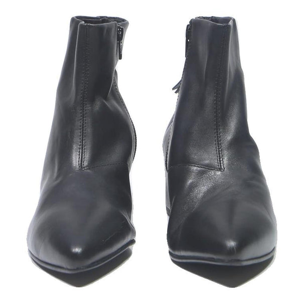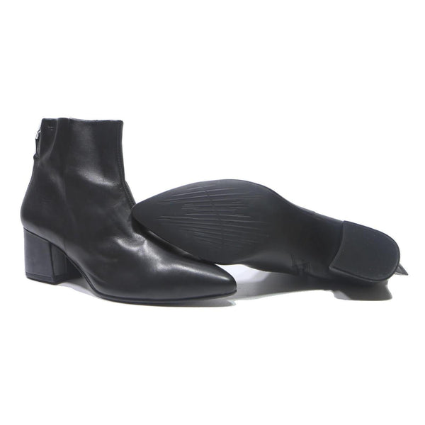 These VAGABOND womens ankle boots feature a sleek, pointed toe design in classic black leather for a sophisticated look. The boots have a smooth leather upper with subtle branding near the top and a practical back zip closure with a leather pull tab for ease of wear.